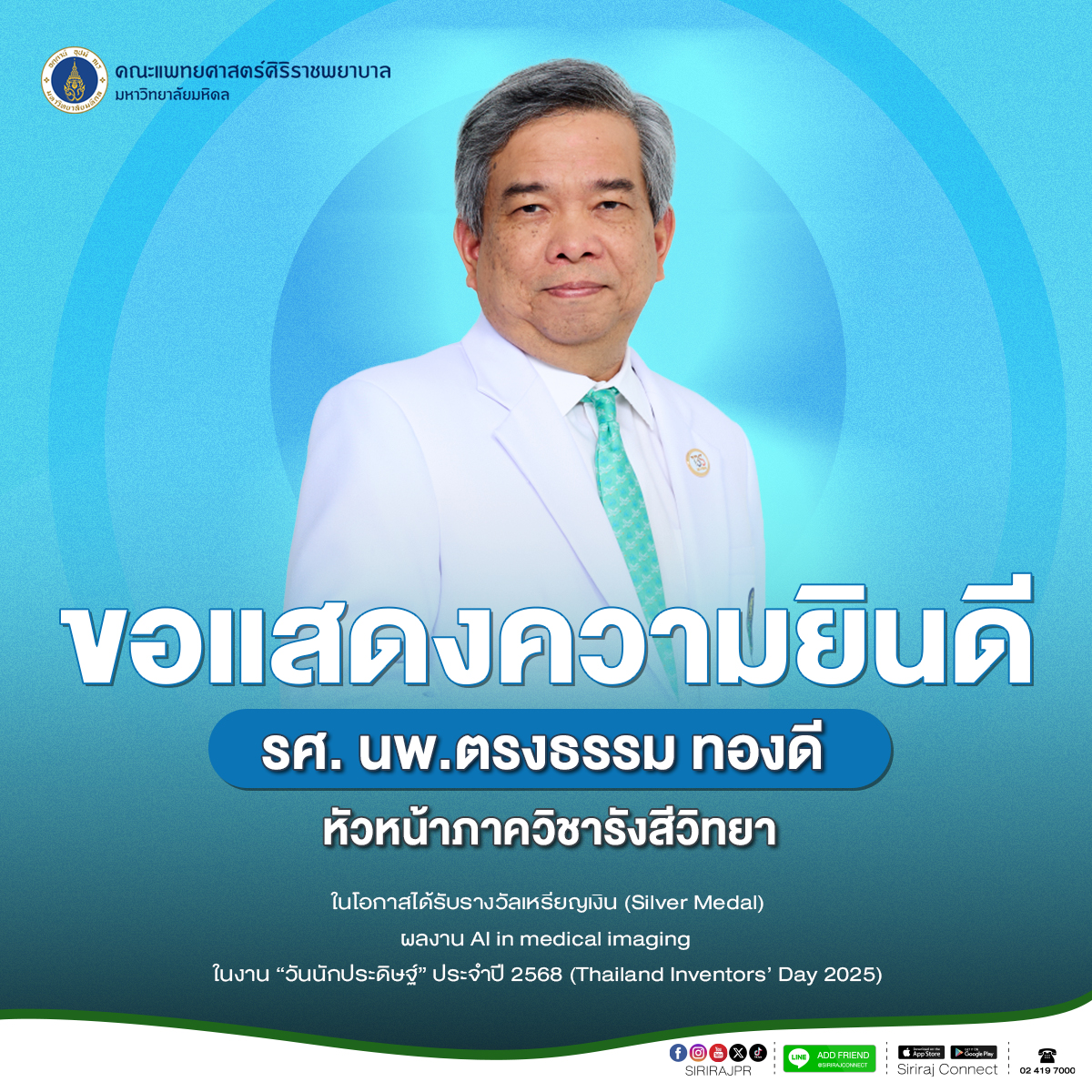 ขอแสดงความยินดีแก่ แก่ รศ. นพ.ตรงธรรม ทองดี หัวหน้าภาควิชารังสีวิทยา และทีมผู้ร่วมวิจัย ในโอกาสได้รับรางวัลเหรียญเงิน (Silver Medal) จากผลงาน AI in medical imaging โดย สำนักงานการวิจัยแห่งชาติ (วช.) และ Global Partnership มอบรางวัล International Intellectual Property, Invention, Innovation and Technology Exposition 2025 (IPITEx 2025) แก่นักประดิษฐ์ไทย-นานาชาติ ในงาน “วันนักประดิษฐ์” ประจำปี 2568 (Thailand Inventors’ Day 2025) ในวันที่ 6 กุมภาพันธ์ 2568 ณ ศูนย์นิทรรศการและการประชุมไบเทค บางนา