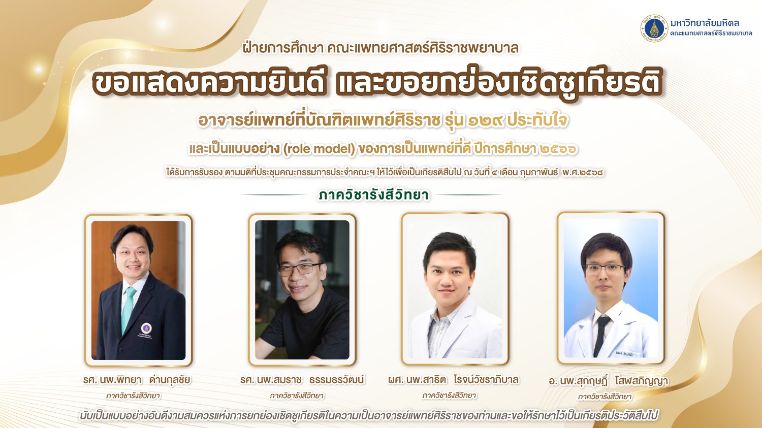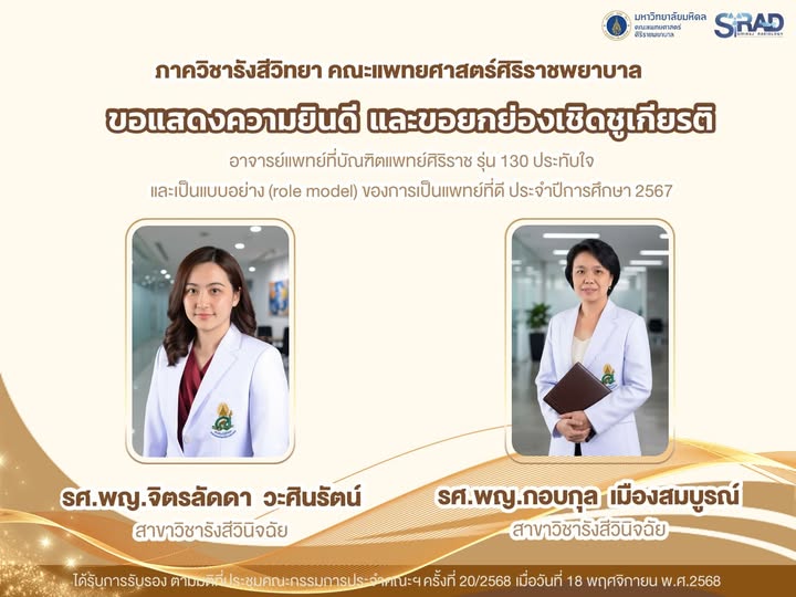 ภาควิชารังสีวิทยา คณะแพทยศาสตร์ศิริราชพยาบาล ขอแสดงความยินดี และขอยกย่องเชิดชูเกียรติ อาจารย์แพทย์ที่บัณฑิตแพทย์ศิริราช รุ่น 130 ประทับใจและเป็นแบบอย่าง (role model) ของการเป็นแพทย์ที่ดี ได้แก่ ได้แก่ รศ.นพ.พิทยา ด่านกุลชัย (สาขาวิชารังสีรักษา) รศ.นพ.สมราช ธรรมธรวัฒน์ (สาขาวิชารังสีวินิจฉัย) ผศ.นพ.สาธิต โรจน์วัชราภิบาล (สาขาวิชารังสีวินิจฉัย) อ.นพ.สุกฤษฏิ์ โสฬสภิญญา (สาขาวิชารังสีวินิจฉัย)