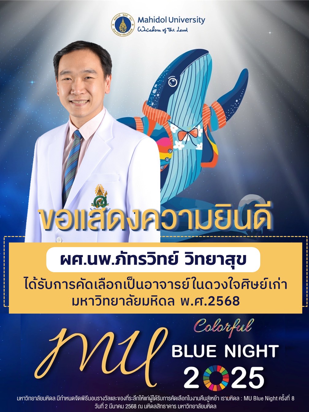 ภาควิชารังสีวิทยา คณะแพทยศาสตร์ศิริราชพยาบาล ขอแสดงความยินดี และขอยกย่องเชิดชูเกียรติ ผศ.นพ. ภัทรวิทย์ วิทยาสุข (สาขาวิชารังสีวินิจฉัย) ที่ได้รับการคัดเลือกเป็นอาจารย์ในดวงใจศิษย์เก่า มหาวิทยาลัยมหิดล พ.ศ. 2568 และรับรางวัลในงานคืนสู่เหย้า เรามหิดล : MU Blue night ครั้งที่ 8 ในวันที่ 2 มีนาคม 2568 ณ มหิดลสิทธาคาร มหาวิทยาลัยมหิดล
