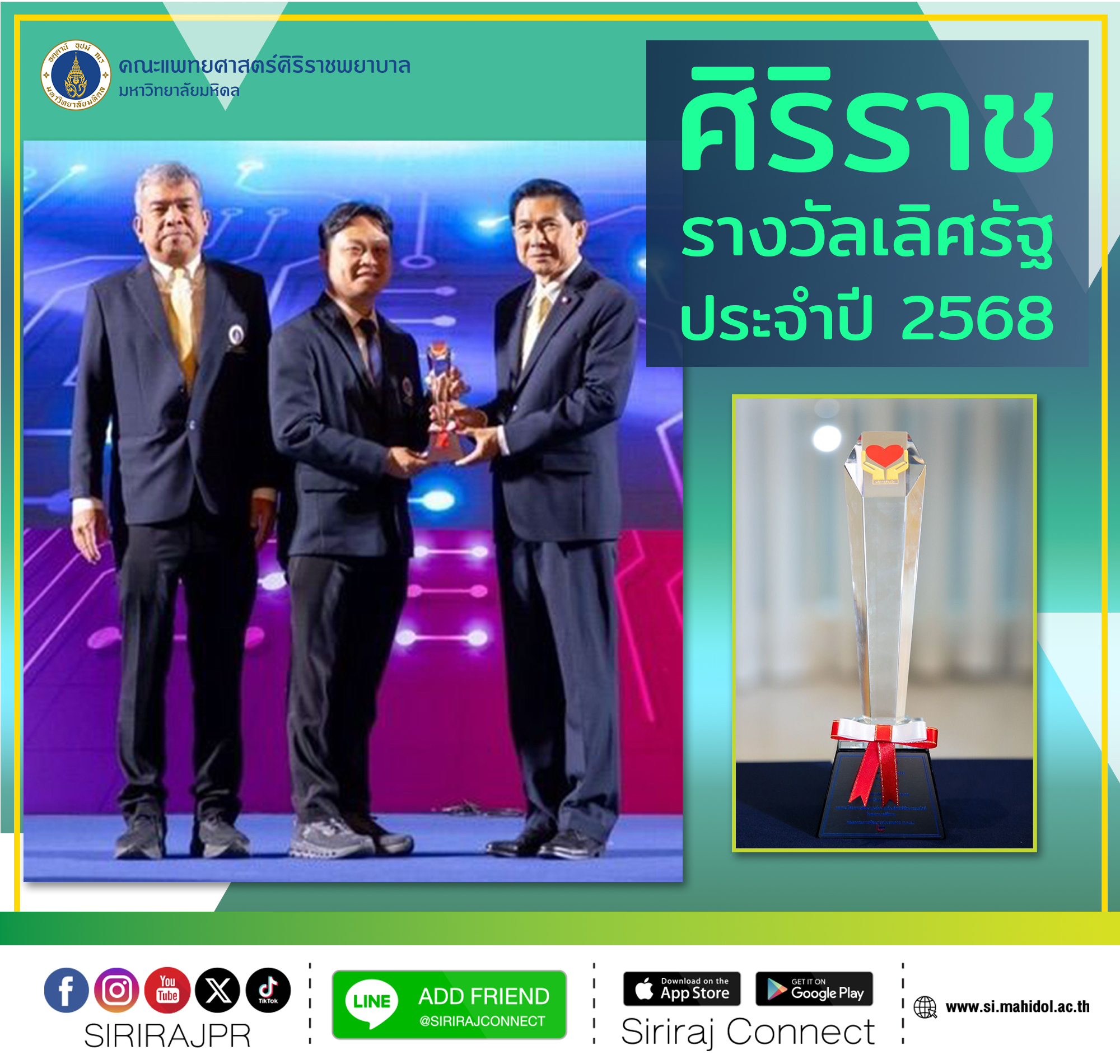 ขอแสดงความยินดีกับ "โครงการพัฒนาศูนย์ความเป็นเลิศรังสีรักษาระยะใกล้ โรงพยาบาลศิริราช" ที่ได้รับรางวัลเลิศรัฐ ประจำปี 2568 ประเภทนวัตกรรมการบริการ ระดับดี ซึ่งเป็นรางวัลอันทรงเกียรติที่มอบให้แก่หน่วยงานภาครัฐที่มีความเป็นเลิศ โดยมี รศ. นพ.พิทยา ด่านกุลชัย หัวหน้าสาขาวิชารังสีรักษา ภาควิชารังสีวิทยา และงานการพยาบาลรังสีวิทยา ฝ่ายการพยาบาล โรงพยาบาลศิริราช เป็นผู้รับผิดชอบโครงการ โครงการดังกล่าวเป็นการพัฒนานวัตกรรมการรักษาผู้ป่วยมะเร็งด้วยเทคโนโลยีรังสีรักษาระยะใกล้ (Brachytherapy) ที่มีความแม่นยำสูง ช่วยเพิ่มประสิทธิภาพการรักษาและลดผลข้างเคียงให้แก่ผู้ป่วย ถือเป็นก้าวสำคัญในการพัฒนาบริการทางการแพทย์ของประเทศ จัดโดยสำนักงานคณะกรรมการพัฒนาระบบราชการ (ก.พ.ร.) เมื่อวันศุกร์ที่ 12 กันยายน 2568 เวลา 13.30 น. ณ ห้องรอยัล จูบิลี่ บอลรูม อาคารชาเลนเจอร์ อิมแพคเมืองทองธานี จังหวัดนนทบุรี