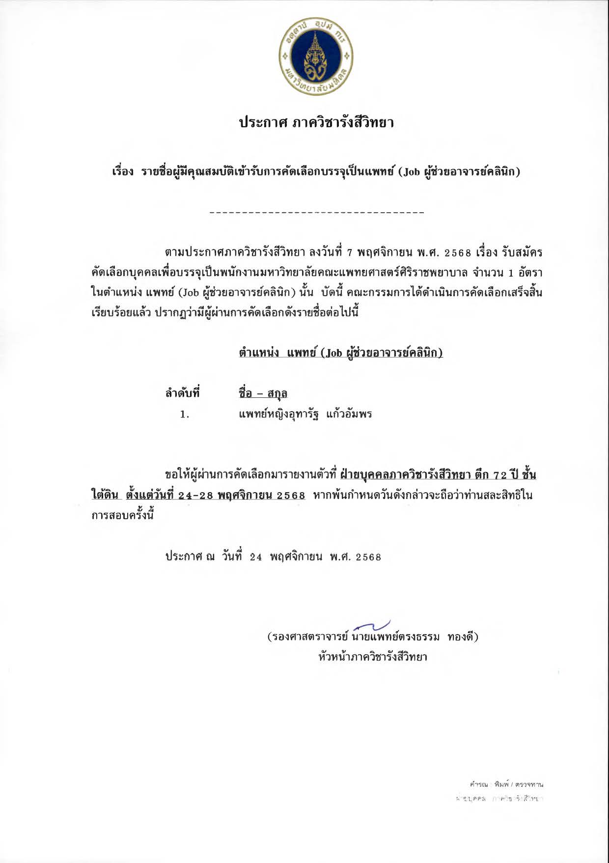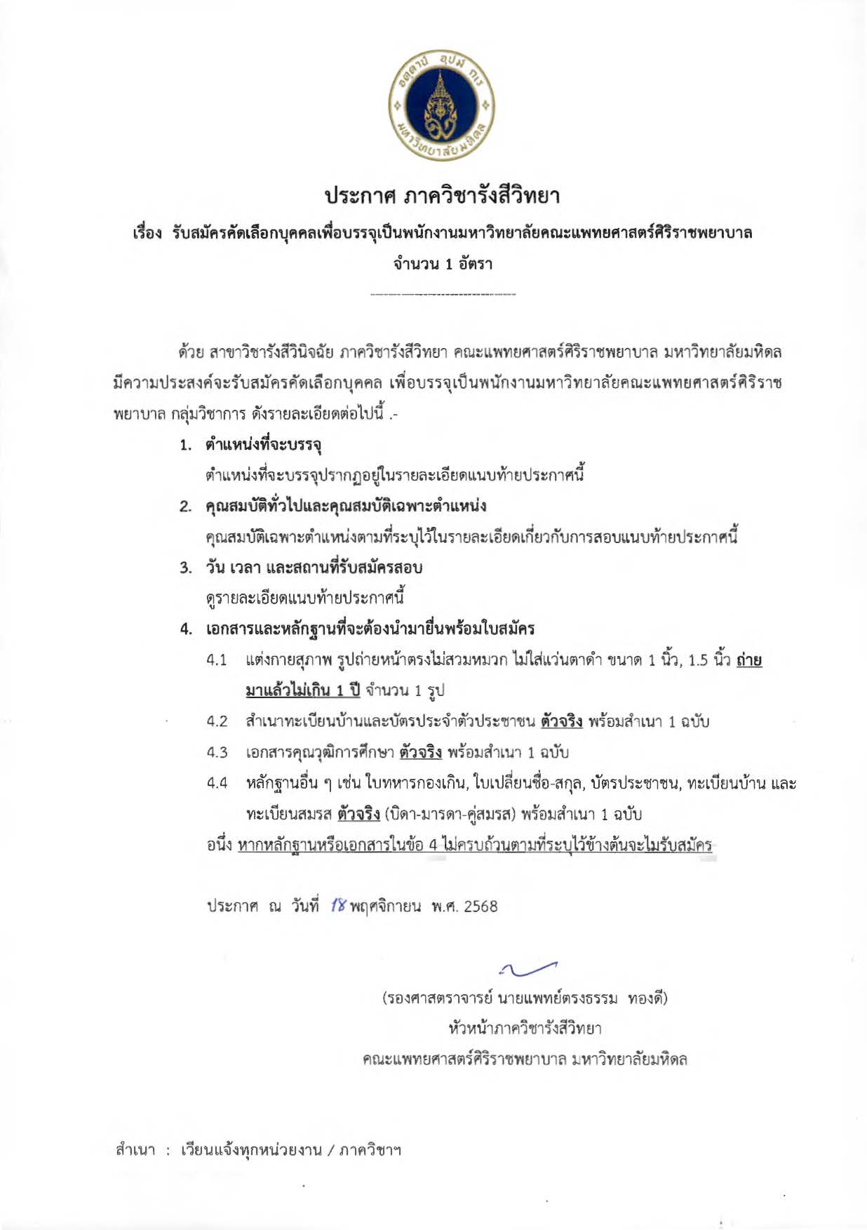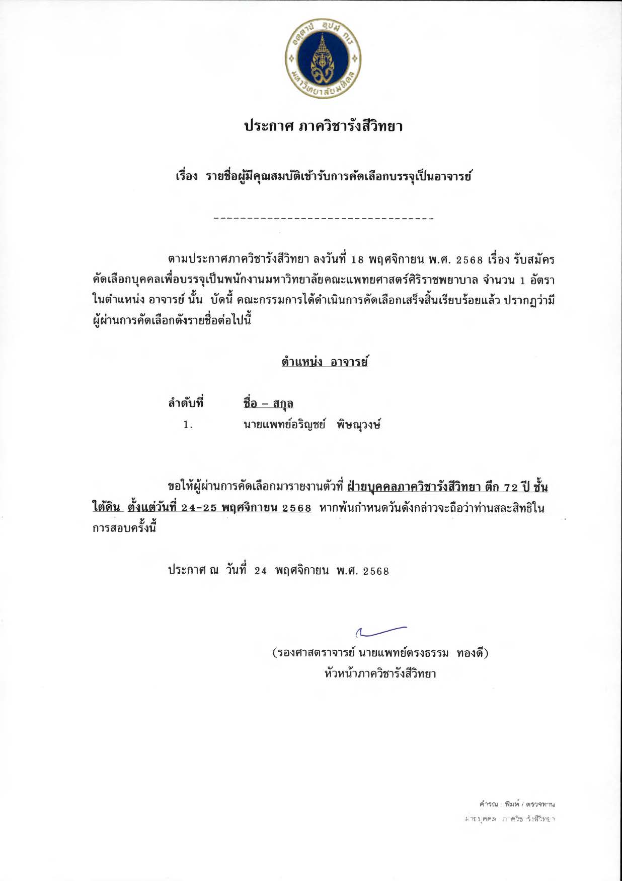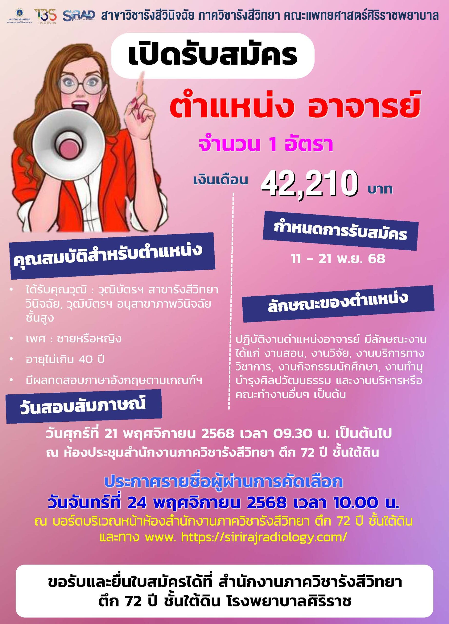 ประกาศ ประกาศรายชื่อผู้มีคุณสมบัติเข้ารับการคัดเลือกบรรจุเป็นอาจารย์ สังกัดสาขาวิชารังสีวินิจฉัย 1 อัตรา ประกาศรายชื่อผู้มีคุณสมบัติเข้ารับการคัดเลือกบรรจุเป็นผู้ช่วยอาจารย์คลินิก สังกัดสาขาวิชารังสีวินิจฉัย 1 อัตรา ประกาศรับสมัครอาจารย์ สังกัดสาขาวิชารังสีวินิจฉัย 1 อัตรา ประกาศรับสมัครบุคลากร สาขาวิชารังสีวินิจฉัย 5 อัตรา ประกาศรายชื่อผู้เข้าร่วมโครงการ Open House เพื่อการฝึกอบรมต่อระดับแพทย์ประจำบ้าน ปีการศึกษา 2569 (Onsite and Online) ภาควิชารังสีวิทยา คณะแพทยศาสตร์ศิริราชพยาบาล วันศุกร์ที่ 5 กันยายน 2568 และ วันศุกร์ที่ 12 กันยายน 2568 ประกาศรับสมัครแพทย์ประจำโรงพยาบาล สังกัดสาขาวิชารังสีวินิจฉัย 1 อัตรา ประกาศรับสมัครบุคลากร สาขาวิชารังสีวินิจฉัย 5 อัตรา ประกาศรับสมัครบุคลากร สาขาวิชารังสีวินิจฉัย 1 อัตรา ประกาศรับสมัครแพทย์ประจำโรงพยบาล สาขาภาพวินิจฉัยระบบประสาท 1 อัตรา รับสมัครแพทย์ประจำโรงพยาบาล ปฏิบัติงาน SiSKN 2 อัตรา รับสมัครพนักงานทั่วไป 3 อัตรา รับสมัครพนักงานการแพทย์และรังสีเทคนิค 4 อัตรา ประกาศรับสมัครบุคลากร สาขาวิชารังสีวินิจฉัย 11 อัตรา รับสมัครพนักงานการแพทย์และรังสีเทคนิค 8 อัตรา รับสมัครพนักงานทั่วไป 2 อัตรา รับสมัครพนักงานสถานที่ 1 อัตรา งานประชุมวิชาการ หัวข้อ “Head and neck meeting: Imaging approach and update” อบรมเชิงปฏิบัติการเรื่อง "เทคนิคการเขียนคู่มือปฏิบัติงานจากงานประจำ" ประกาศผลผู้ผ่านการสอบคัดเลือกบรรจุ ตำแหน่ง “แพทย์ประจำโรงพยาบาล”ประกาศ ณ วันที่ 1 ธันวาคม พ.ศ.2564 แนวทางปฏิบัติในการรับ-ส่งเพื่อฝึกอบรม/ปฏิบัติงาน ในสถานการณ์การระบาดของโรค COVID-19แนวทางปฏิบัติในการรับ-ส่ง นักศึกษาสาขารังสีเทตนิค นักศึกษาปริญญาโทหลักสูตรฟิสิกส์ การแพทย์แพทย์ประจำบ้าน และแพทย์ประจำบ้านอนุสาขา เพื่อฝึกอบรม/ปฏิบัติงาน (Elective) ในสถานการณ์การระบาดของโรค COVID-19 เปิดรับสมัครแพทย์ (Job แพทย์ประจำโรงพยาบาล)ภาควิชารังสีวิทยา เปิดรับสมัครแพทย์ (Job แพทย์ประจำโรงพยาบาล) จำนวน 4 อัตรา หรือติดต่อสอบถามขอใบสมัครได้ที่ สำนักงานภาควิชารังสีวิทยา ตึก 72 ปี ชั้นใต้ดิน เบอร์โทรศัพท์ 02-419-7079 (ในวันเวลาราชการ) ประกาศภาควิชารังสีวิทยา คณะแพทยศาสตร์ศิริราชพยาบาลเนื่องด้วยสถานการณ์โควิด ทางภาควิชารังสีวิทยา ขอความกรุณาผู้ที่พักอาศัย หรือมีประวัติการเดินทางไปในจังหวัดสมุทรสาคร และพื้นที่ สีแดง สีส้ม ตามประกาศ ศบค. ร่วมกับมีความเสี่ยง คู่มือดูแลตัวเองสำหรับประชาชน สู้โควิด-19 ไปด้วยกัน (เมษายน 2563)สำนักงานกองทุนสนับสนุนการสร้างเสริมสุขภาพ (สสส.) ได้จัดทำ คู่มือ ดูแลตัวเองสำหรับป
